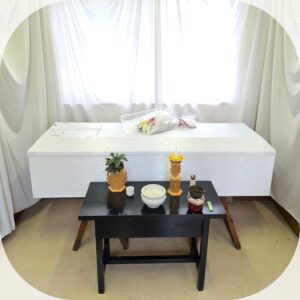 ご逝去先の病院まで寝台車にてお迎えにあがり、通夜の日を迎えるまでは当社の安置所にてお体を保全しながら大切に故人様をご安置させて頂きました。そしてご家族様と葬儀の日程や詳細について打ち合わせをさせて頂きまして、当社で死亡届を区役所へ提出して火葬に必要な手続きを代行致しました。